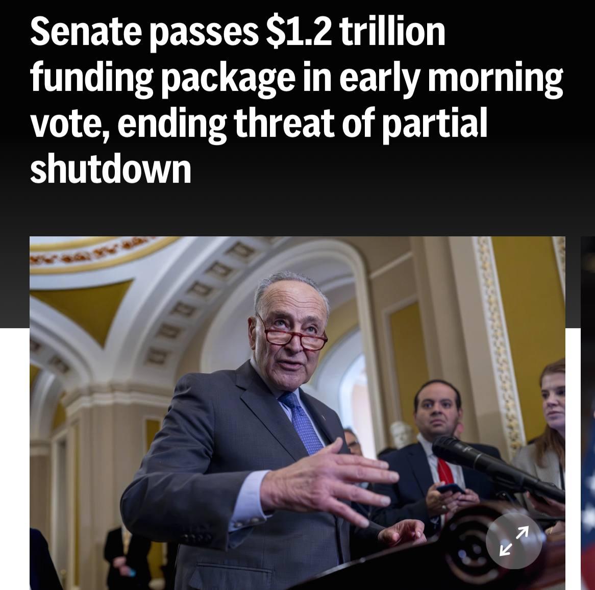 🔹Сенат США схвалив законопроєкт про фінансування уряду на 1,2 трильйона доларів.
