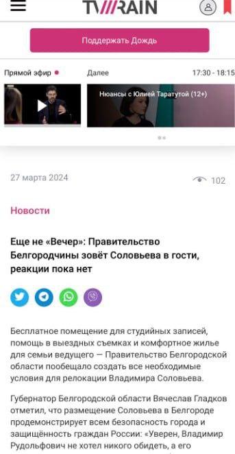 Белгородцы зовут Соловьёва к себе в гости, после того, как пропагандон назвал жалобы белгородцев мерзкой истерикой. Теперь скандал вышел на новый уровень. Но Соловьёв сцыт и не едет. Его уже и местные оккупационные власти зовут, но Рудольфычу страшно, он гадит себе в штаны и не едет. Жаль, что не едет. РДК и Легион Свобода России на него бы поохотились.